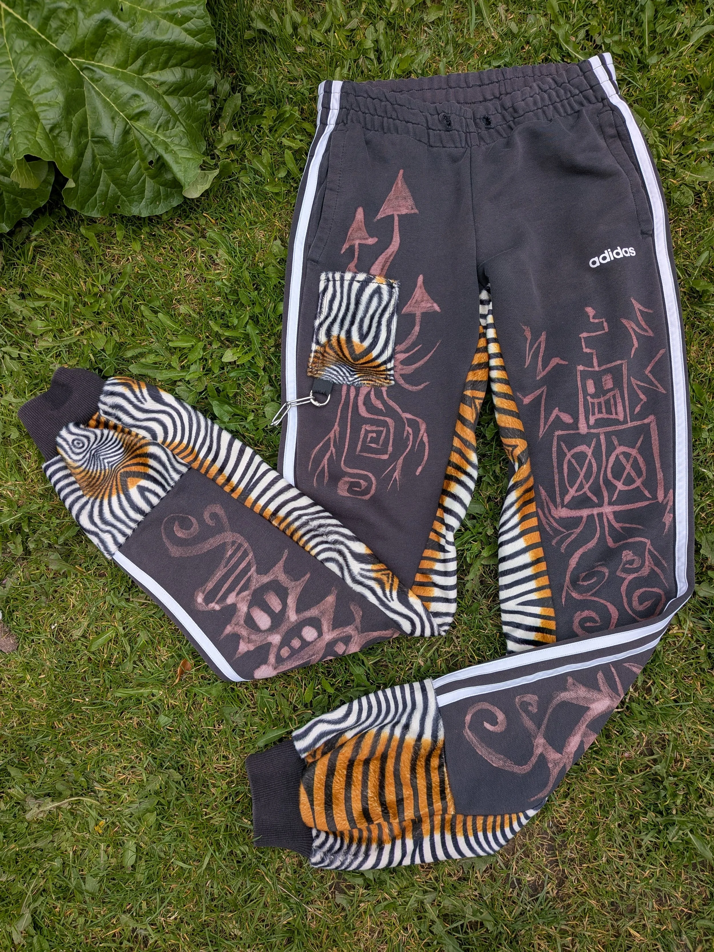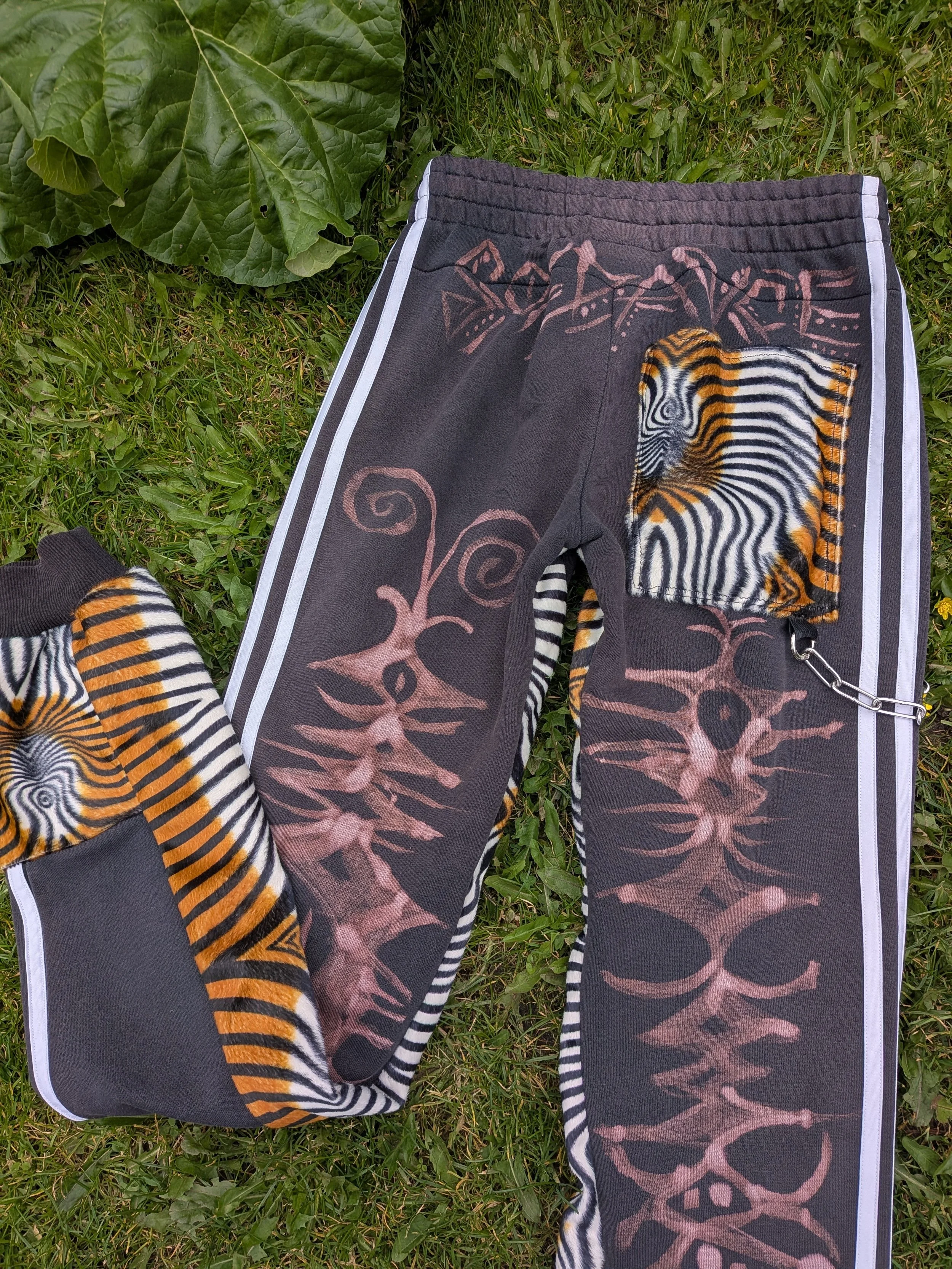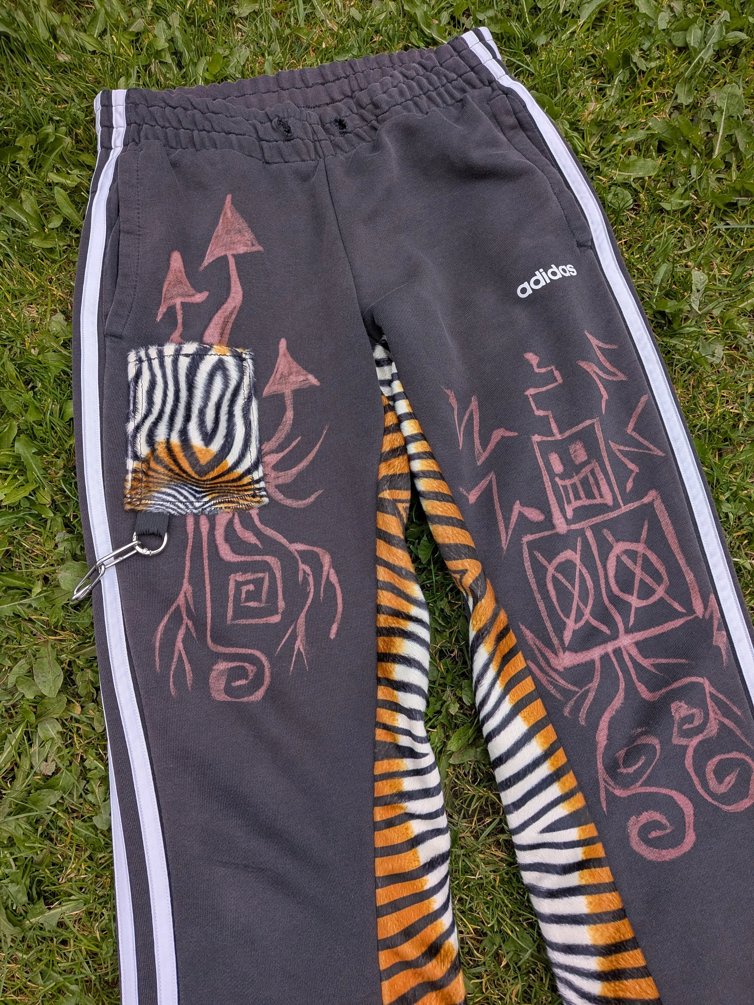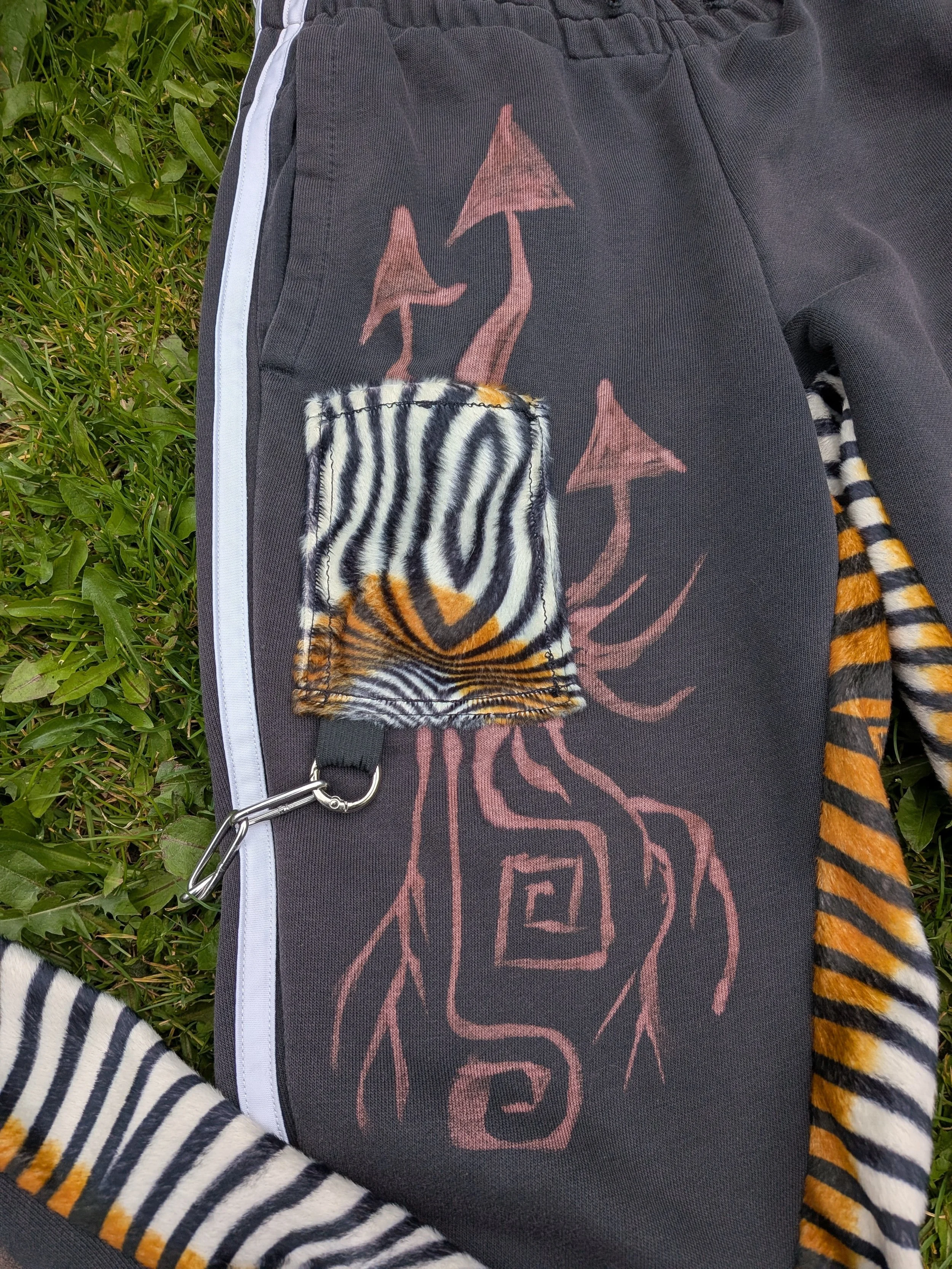 Faux trippy tiger skin & hand painted soundsystem & mushroom tribal art with soldance tag spellout across the back 🔊🌿
